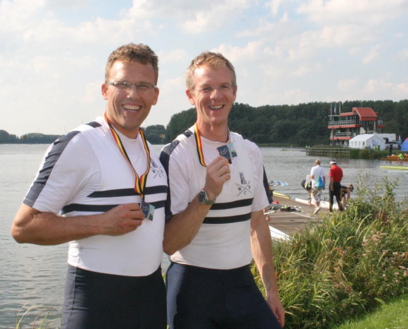 Two Warwick Boat Club crews made the trip to Hazewinkel in Belgium last week, joining more than 11,000 rowers from 49 countries, to compete at the World Rowing Masters Regatta. Hopeful of success after their National Masters Championship title, Paul Gosling and Andre Delahaye competing in the Masters C category double sculls for 43-50 year olds led from start to finish in their 1000m race on their first visit to the World Masters. “The format is a little unusual so luck plays a role, but the competition is tough and we were delighted with our win” said Gosling. Racing again in the in Masters A category for 27-36 year olds in pouring rain, they were unable to repeat their success and despite a strong second half finished two seconds behind the winners.